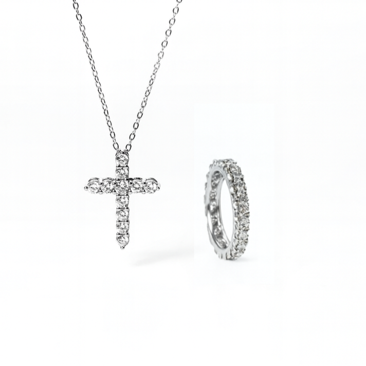 Sidabrinis (925) žiedas + sidabrinis (925) pakabukas kryželis su cirkonio kristalais, tai papuošalų rinkinys dvelkiantis elegancija.