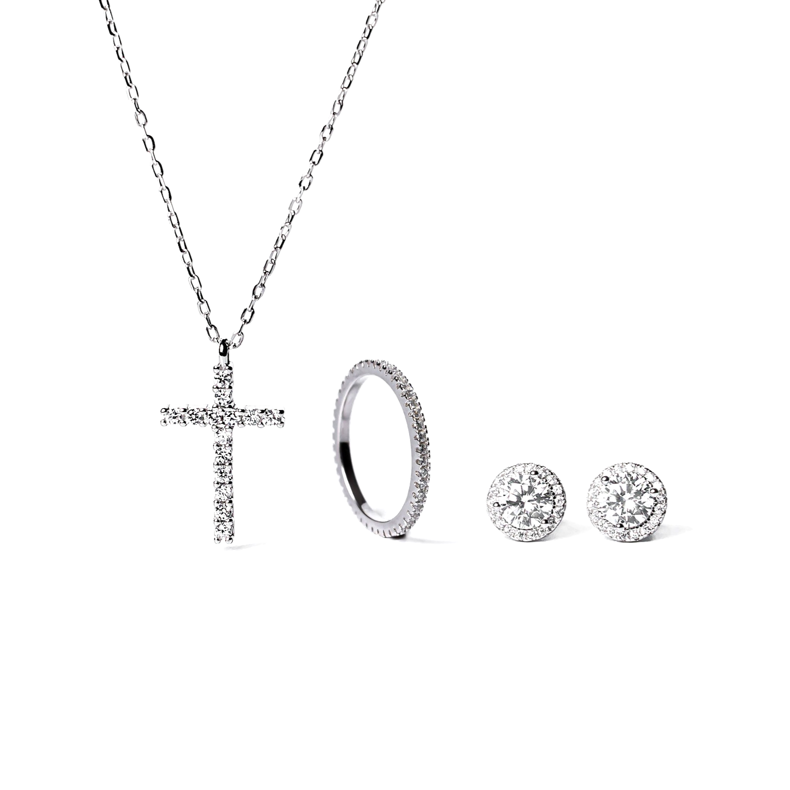 Sidabriniai (925) auskarai + sidabrinis (925) pakabukas kryželis + sidabrinis (925) žiedas juostelė su cirkonio kristalais.